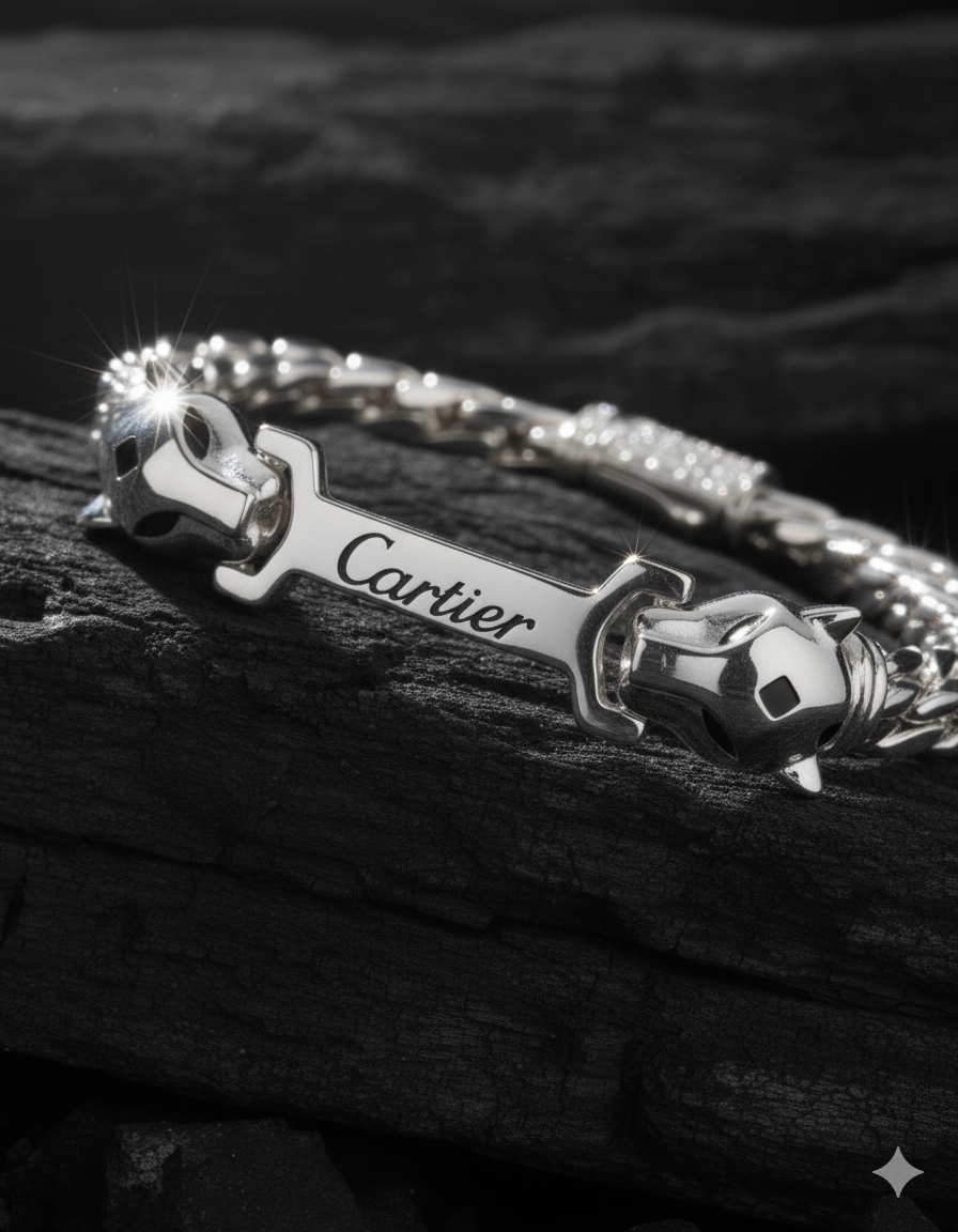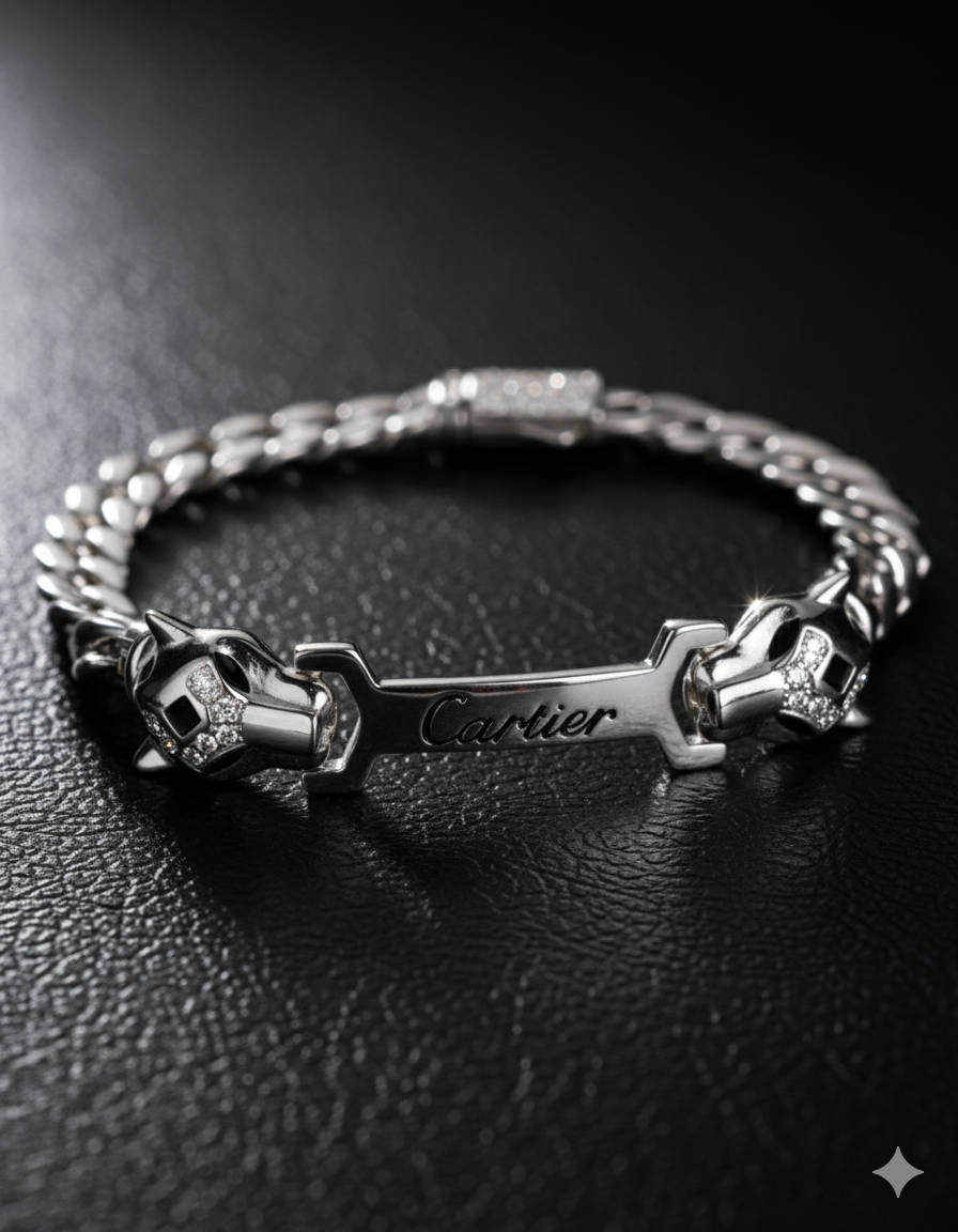 A bold sterling silver men’s bracelet featuring dual panther-head motifs and a polished central plate. Modern, powerful, and crafted for standout styling. Ideal for both casual and upscale outfits, it adds an unmistakable touch of personality and confidence.