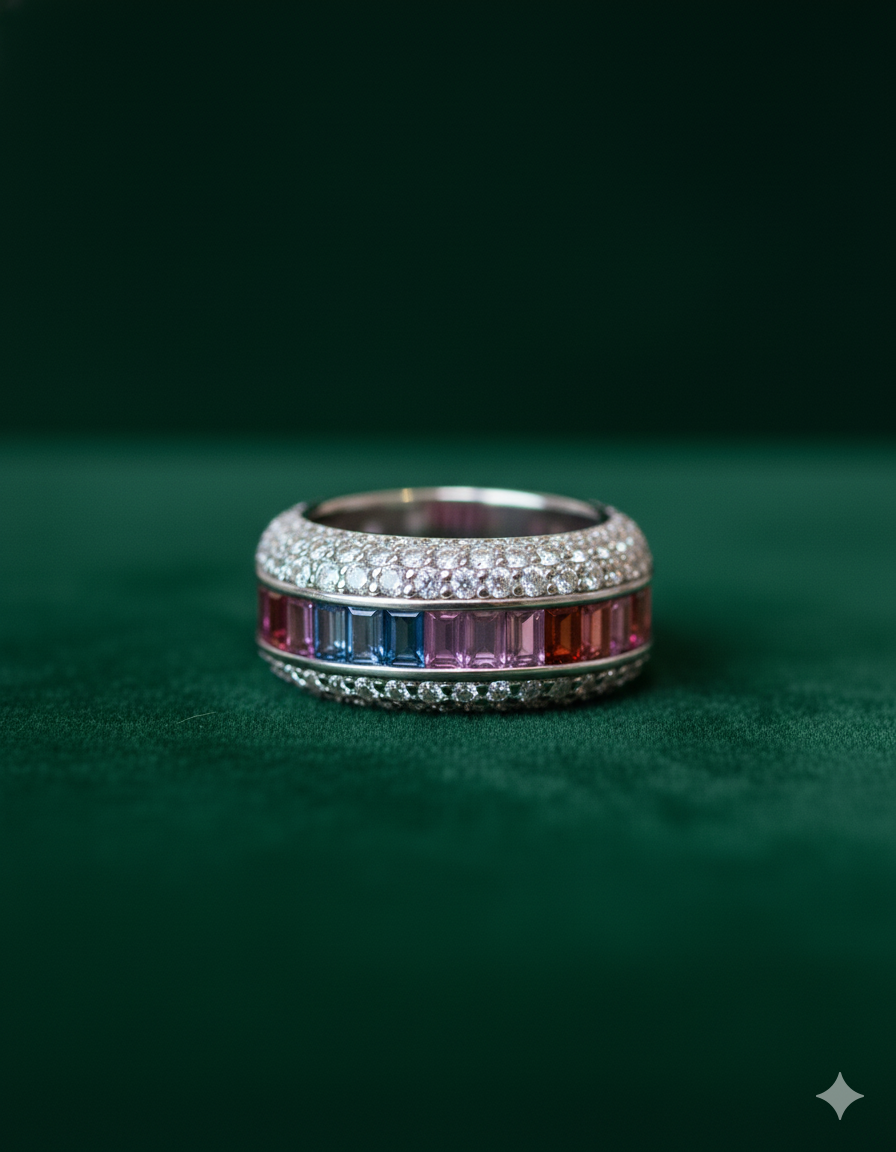 A vibrant sterling silver band featuring a striking row of multi-colored baguette stones framed by shimmering pavé crystals. Bold, modern, and full of personality. With its wide band and contemporary feel, this ring is perfect for making a stylish statement at parties, festive events, or as a standout everyday accessory.